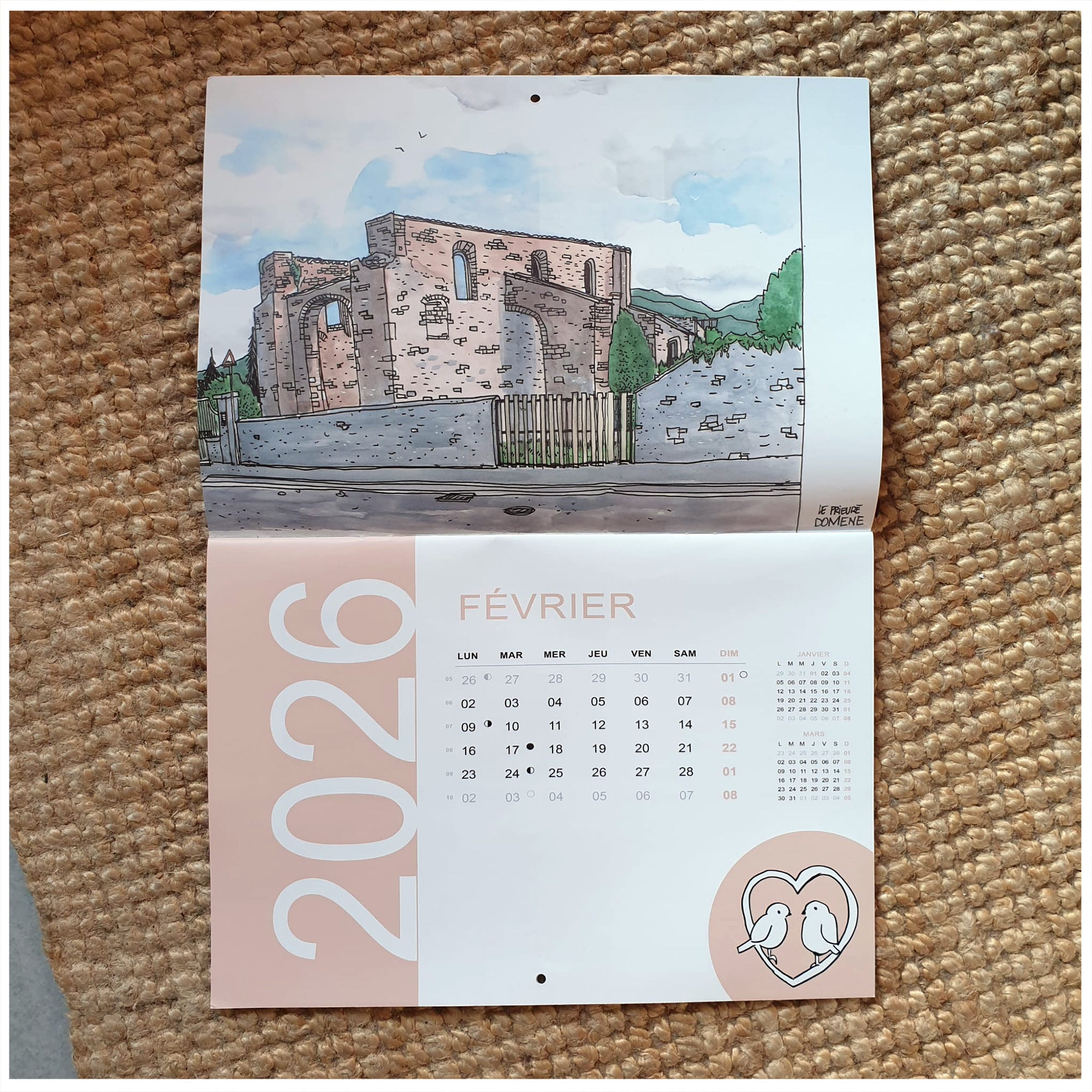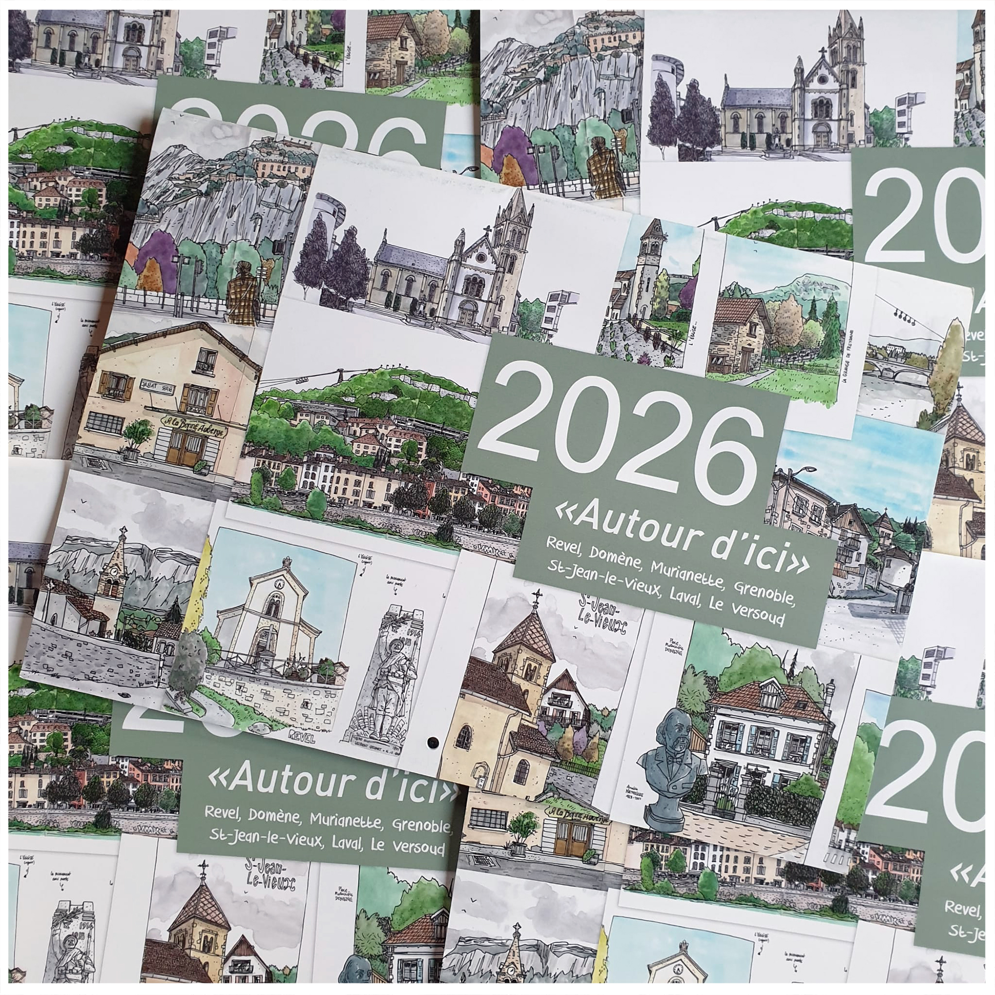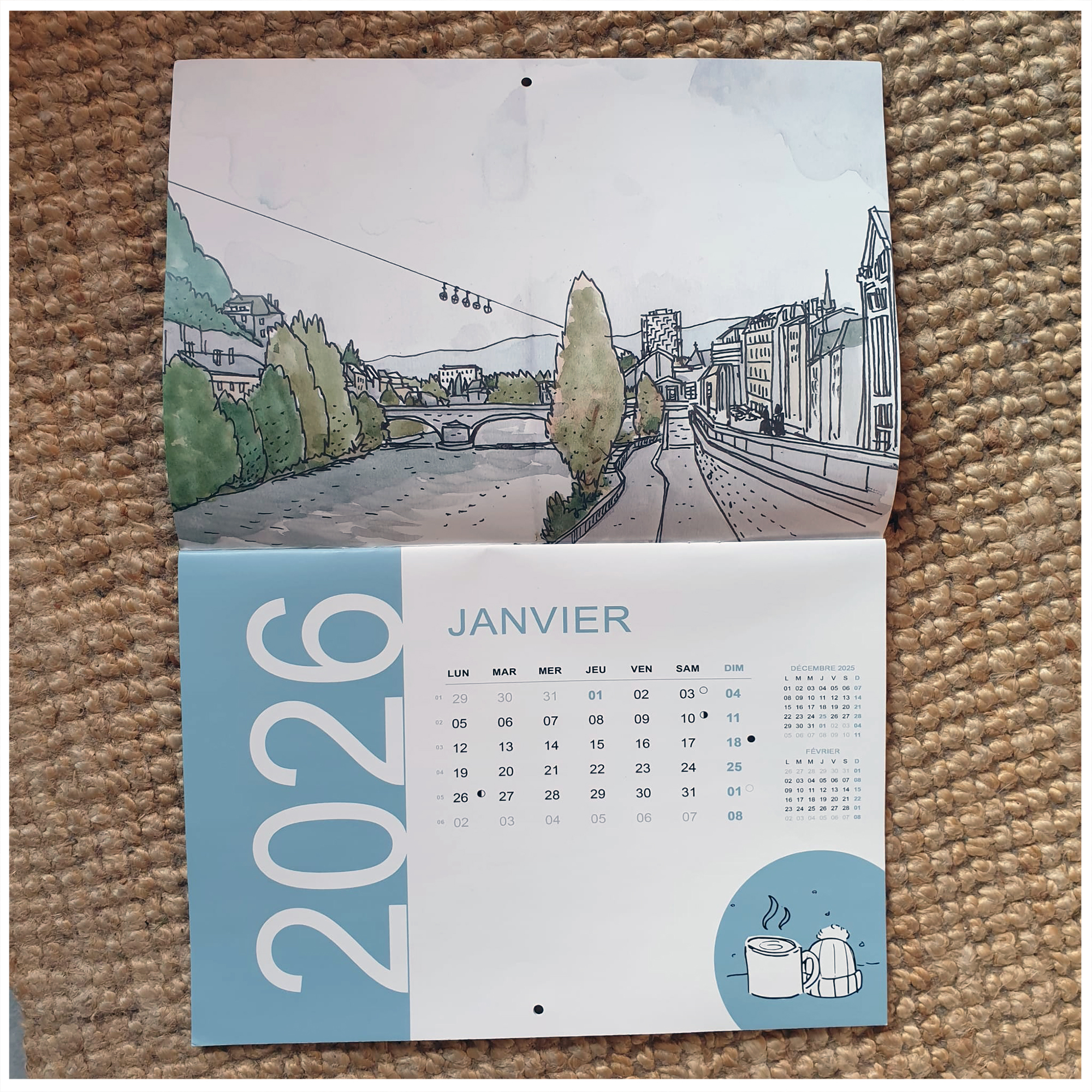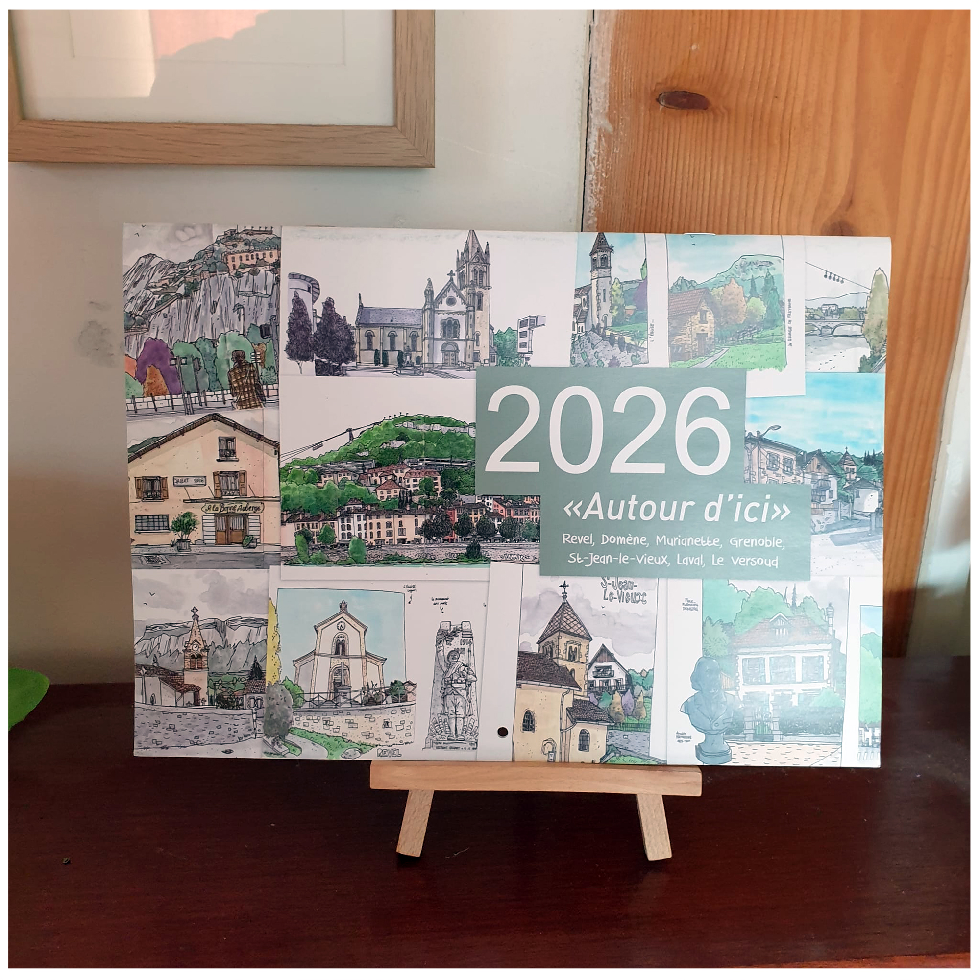Un calendrier 2026 illustré par emdé avec des croquis réalisés in situ autour de chez lui Format A4 29,7X21 // ouvert : 42X29,7